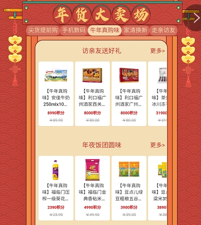 春节将至,中国联通严格贯彻落实结合疫情防控工作要求、结合春节消费特点、依托中国联通积分商城平台打造主题为”牛年囤牛货 享牛价”的网上年货活动,实折实扣为全国用户提供翻签许愿、优惠券免费领、积分兑牛礼等形式多样、内容丰富的促销活动,满足春节期间各种生活场景所需。