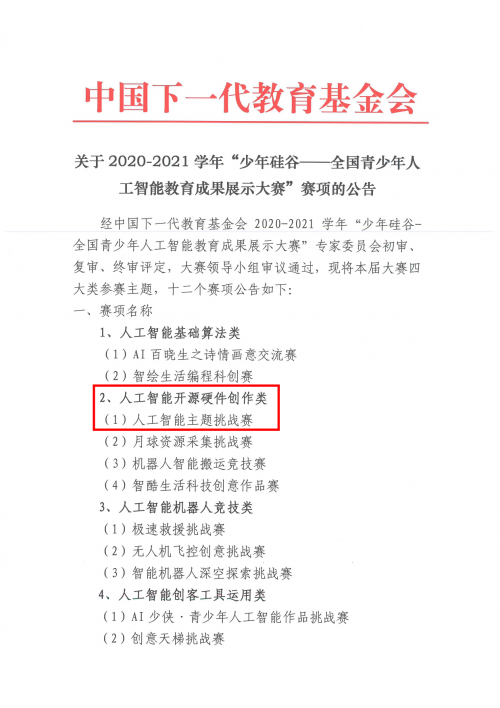 经中国下一代教育基金会2020-2021学年“少年硅谷——全国青少年人工智能教育成果展示大赛”专家委员会初审、复审、终审评定,大赛领导小组审议通过,威盛电子(中国)有限公司作为本届赛事技术支持单位之一,其中,“人工智能开源硬件创作类-人工智能主题挑战赛”赛项经赛事组委会确认,公告如下: